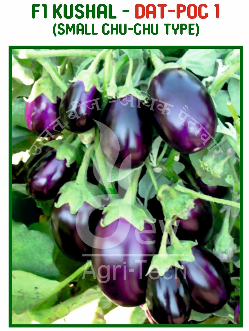 maturity : 65-70 days after transplant fruit shape : oblong avg. weight : 50-60 gm Color / Texture : shiny purple features : Plants are erect, bushy in growth which produces shiny purple color fruits with low seeds content and excellent taste