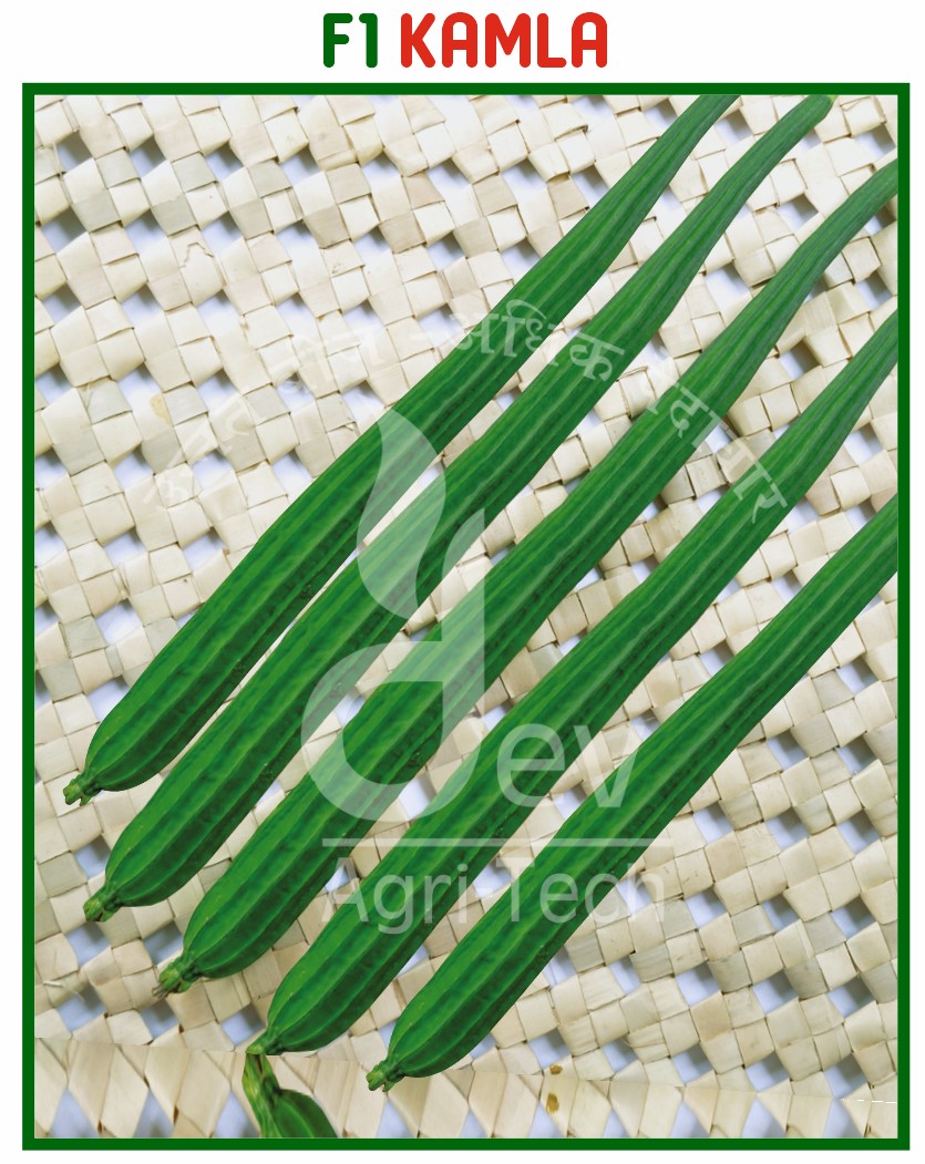First Picking : 45-60 Days After Sowing. Fruit Color : dark Green. Fruit Length : 30-35 cm. fruit weight : 140-165 gm USP : Good Yielding Vigorous Hybrid with 20-25 Green Fruits Per Plant Vine, long Medium Thin.